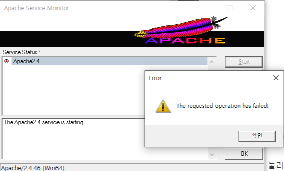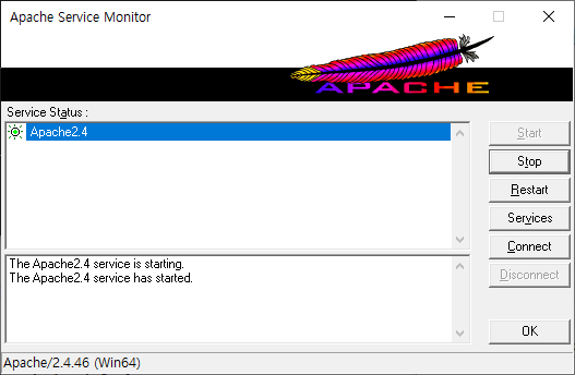 apache monitor에 start / stop / restart 등 버튼이 보인다.