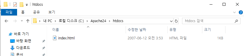 C: 드라이브에 Apache24폴더를 위치시켰고, htdocs는 그 디렉토리 안에 들어있다.