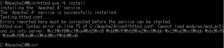 C:/Apache24/bin 에 들어가 httpd.exe를 실행시켜 설치한다.