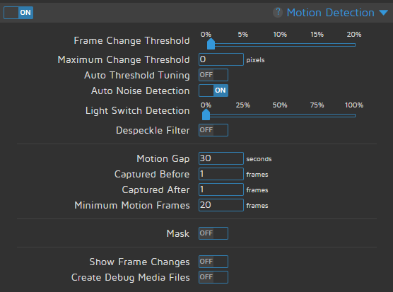 Create Debug Media Files: enable시키면 모션디텍팅에 문제가 있을 때 디버깅할 수 있도록 영상을 생성해준다.