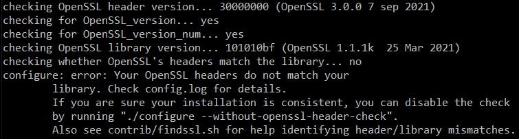 내 경우에는 이번에 설치한 3.0.0의 header를 찾았으나, 기존에 설치되어 있던 1.1.1 library가 남아있어 mismatch error가 발생했었다.